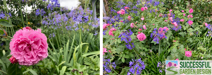 Lots of one of my favourite combinations of blue Agapanthus and old-fashioned roses.
