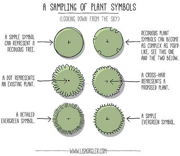 Let’s cover individual plant symbols first. I’ve included an illustration below showcasing a sampling of plant symbols, plus I created a short video so you can actually see the drawing process.