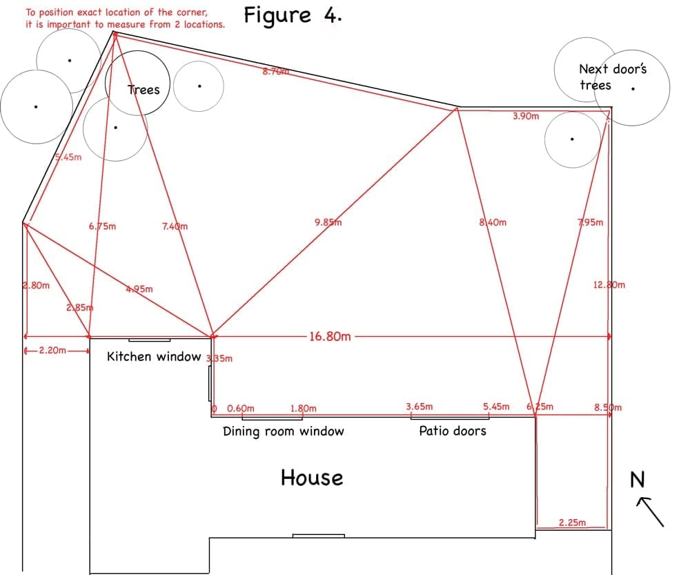 If you don’t have a survey plan you will need to measure the entire garden as shown in Figure 4 below. When you draw up the survey measurements they will need to be to a scale of 1:100 which is 1 cm on the paper = 1 metre on the ground or the imperial equivalent is 1/8 of an inch = 1ft.