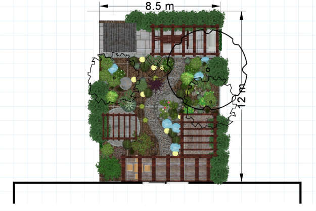 Here’s the design a designer came up with for the garden. As you can see there’s a lot of upright structures to create plenty of shady seating areas…